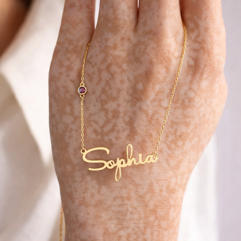 Le collier Serena met en valeur une plaque prénom personnalisée accompagnée d’une pierre de naissance, pour un bijou unique et symbolique. Conçu en acier inoxydable premium avec finition or 18K (PVD) ou argent, il résiste à l’eau et se porte facilement tous les jours.